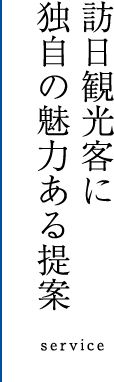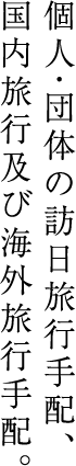 日本国内で必要な宿泊施設、移動手段(JR・飛行機・バス・タクシー・船)など飲食店・観光施設・ガイドなど手配。 日本の魅力を存分に味わって頂くために四季折々のツアーの手配及び企画。現在の東京・京都・大阪以外の商品の開発・紹介。 営業・手配・ガイドの一括管理によりスムーズで迅速なおもてなしツアーの実施。日本国内旅行中のお困りのことやご希望を伺える専用デスクの設置。